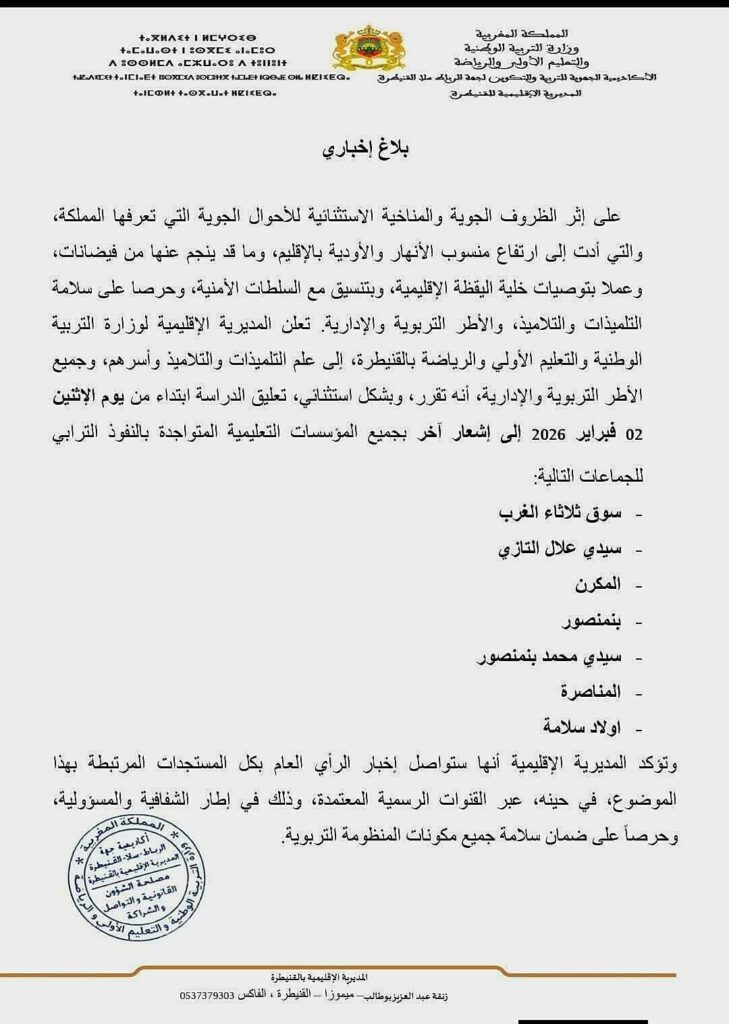 أعلنت المديرية الإقليمية لوزارة التربية الوطنية والتعليم الأولي والرياضة بالقنيطرة، التابعة للأكاديمية الجهوية لجهة الرباط-سلا-القنيطرة، عن تعليق الدراسة ابتداءً من يوم الإثنين 02 فبراير 2026 وإلى إشعار آخر في جميع المؤسسات التعليمية التابعة لسبع جماعات، وذلك استجابة لتوصيات “خلية اليقظة الإقليمية” وحرصاً على سلامة التلميذات والتلاميذ والأطر التربوية والإدارية.